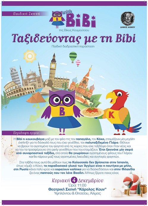 Ο Δήμος Αλίμου παρουσιάζει την παιδική διαδραστική παράσταση «Ταξιδεύοντας με την Bibi» την Κυριακή 4 Δεκεμβρίου, στις 11 το πρωί, στο θέατρο «Κάρολος Κουν» (Υψηλάντου & Θησείου). Μια κουκουβάγια κι ένας παπαγάλος σε συναρπαστικά ταξίδια γεμάτα γνώσεις!