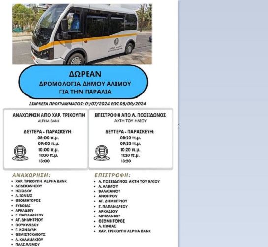 Ο Δήμος Αλίμου, θέλοντας να δώσει μια ανάσα δροσιάς στους πολίτες που θα βρίσκονται στην πόλη μας το καλοκαίρι, ξεκινάει και φέτος τα ειδικά ΔΩΡΕΑΝ ΔΡΟΜΟΛΟΓΙΑ της Δημοτικής Συγκοινωνίας για θαλάσσια μπάνια.