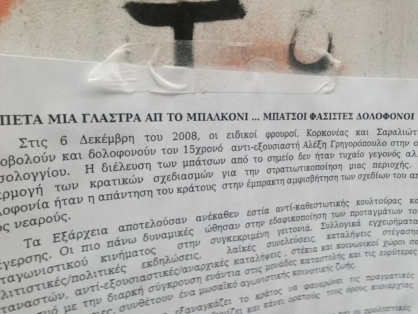 Επίσης φυλλάδια που θυροκολλήθηκαν τις τελευταίες μέρες σε πολυκατοικίες στα Εξάρχεια παροτρύνουν τους πολίτες να «πετάξουν μία γλάστρα από το μπαλκόνι» με στόχο αστυνομικούς.