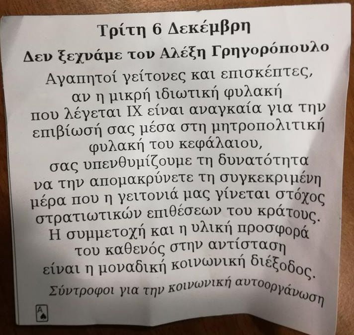 «Αγαπητοί γείτονες και επισκέπτες, αν η μικρή ιδιωτική φυλακή που λέγεται ΙΧ είναι αναγκαία για την επιβίωσή σας μέσα στη μητροπολιτική φυλακή του κεφαλαίου, σας υπενθυμίζουμε τη δυνατότητα να την απομακρύνετε τη συγκεκριμένα ημέρα που η γειτονιά μας γίνεται στόχος στρατιωτικών επιθέσεων του κράτους. Η συμμετοχή και η υλική προσφορά του καθενός στην αντίσταση είναι η μοναδική διέξοδος». Το κείμενο υπογράφουν οι «Σύντροφοι για την κοινωνική αυτοοργάνωση».