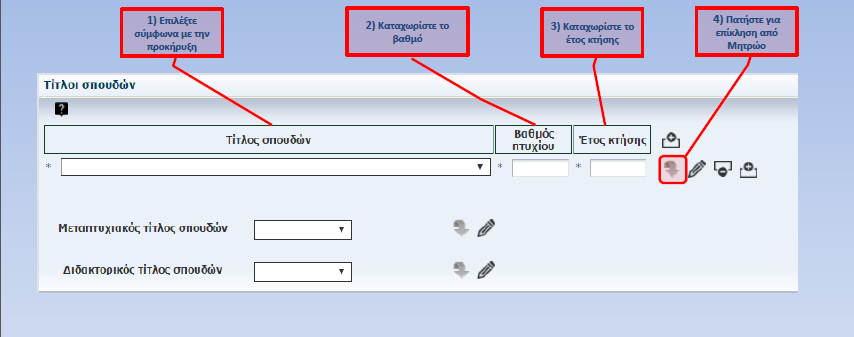 2. Πριν τη συμπλήρωση της αίτησης, καταχωρίστε στο Μητρώο τα προσόντα σας (Τίτλος Σπουδών, Μεταπτυχιακά κ.τ.λ.)