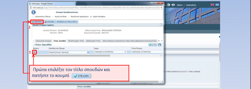 10. Ένα αναδυόμενο παράθυρο θα εμφανίσει την αντίστοιχη καρτέλα του μητρώου που έχετε ήδη συμπληρώσει. Πρώτα επιλέξτε τον τίτλο σπουδών και πατήστε το κουμπί «επιλογή». Στη συνέχεια το αναδυόμενο παράθυρο θα κλείσει και θα επιστρέψετε στην αίτηση.