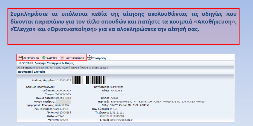 12. Συμπληρώστεταυπόλοιπαπεδία της αίτησης ακολουθώντας τις οδηγίες που δίνονται παραπάνω για τον τίτλο σπουδών και πατήστε τα κουμπιά «Αποθήκευση» , «Έλεγχο» και «Οριστικοποίηση» για να ολοκληρώσετε την αίτησή σας.