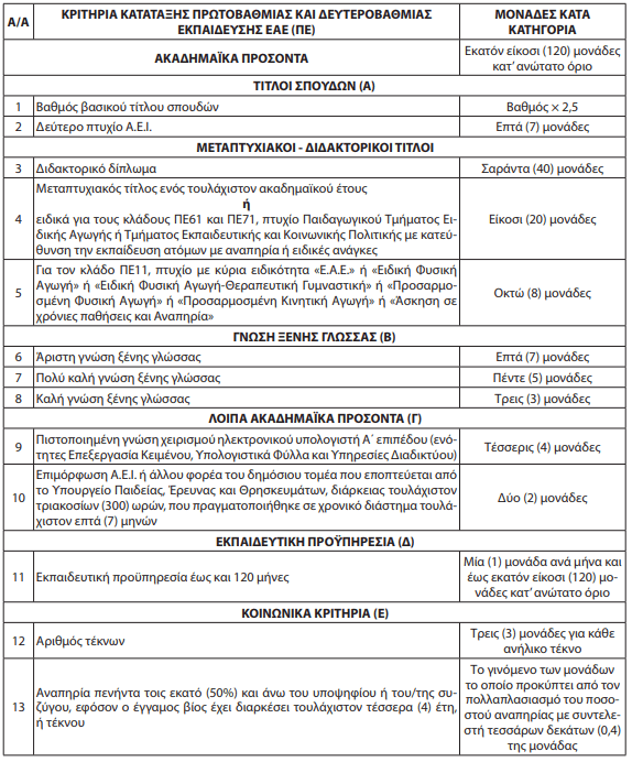 ΕΠΙΣΗΜΑΝΣΗ: Την ευθύνη της ορθής συμπλήρωσης της ηλεκτρονικής αίτησης φέρει αποκλειστικά ο υποψήφιος. Επειδή η επεξεργασία των αιτήσεων γίνεται μηχανογραφικά, οι υποψήφιοι υποχρεούνται να συμπληρώσουν τα οικεία τετραγωνίδια/πεδία των ηλεκτρονικών αιτήσεων, καθώς και τους κωδικούς που αναφέρονται σε αντίστοιχα προσόντα ή κριτήρια ή ιδιότητες που απαιτούνται και διαθέτουν. Αν οι υποψήφιοι δεν συμπληρώσουν τα τετραγωνίδια/πεδία αυτά ή τους κωδικούς ή αν συμπληρώσουν άλλα τετραγωνίδια ή κωδικούς, πλην εκείνων που αναφέρονται στα συγκεκριμένα προσόντα ή κριτήρια ή ιδιότητες ή αν τα αναφέρουν σε άλλα σημεία της ηλεκτρονικής αίτησης, δεν λαμβάνονται υπόψη τα προσόντα ή κριτήρια ή ιδιότητες, έστω και αν τα σχετικά δικαιολογητικά υποβληθούν στις οικείες Διευθύνσεις Εκπαίδευσης.