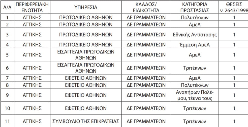 Με το έγγραφο αυτό καθορίζονται το συνολικό αριθμό των θέσεων εργασίας στο Υπουργείο Δικαιοσύνης, που πρόκειται να πληρωθούν από άτομα που προστατεύονται από τις διατάξεις του ν. 2643/1998, σε έντεκα (11).