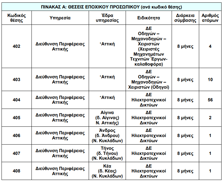 των Μονάδων της Διεύθυνσης Περιφέρειας Αττικής (ΔΠΑ), που εδρεύουν στους Νομούς Αττικής και Κυκλάδων και συγκεκριμένα του εξής, ανά υπηρεσία, έδρα, τόπο απασχόλησης, ειδικότητα και διάρκεια σύμβασης, αριθμού ατόμων: