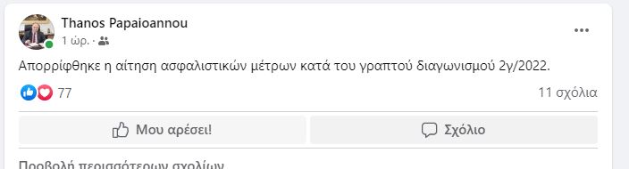 Ο κ. Παπαϊωάννου, σε σημερινή ανάρτησή του σε μέσο κοινωνικής δικτύωσης, αναφέρει ότι: «Απορρίφθηκε η αίτηση ασφαλιστικών μέτρων κατά του γραπτού διαγωνισμού 2Γ/2022».