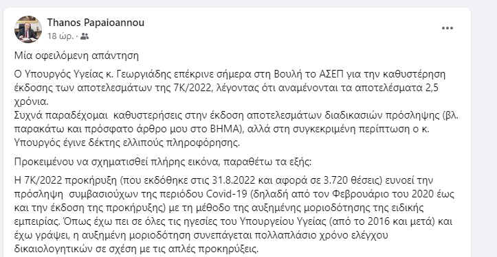 Ο Υπουργός Υγείας κ. Γεωργιάδης επέκρινε σήμερα στη Βουλή το ΑΣΕΠ για την καθυστέρηση έκδοσης των αποτελεσμάτων της 7Κ/2022, λέγοντας ότι αναμένονται τα αποτελέσματα 2,5 χρόνια.