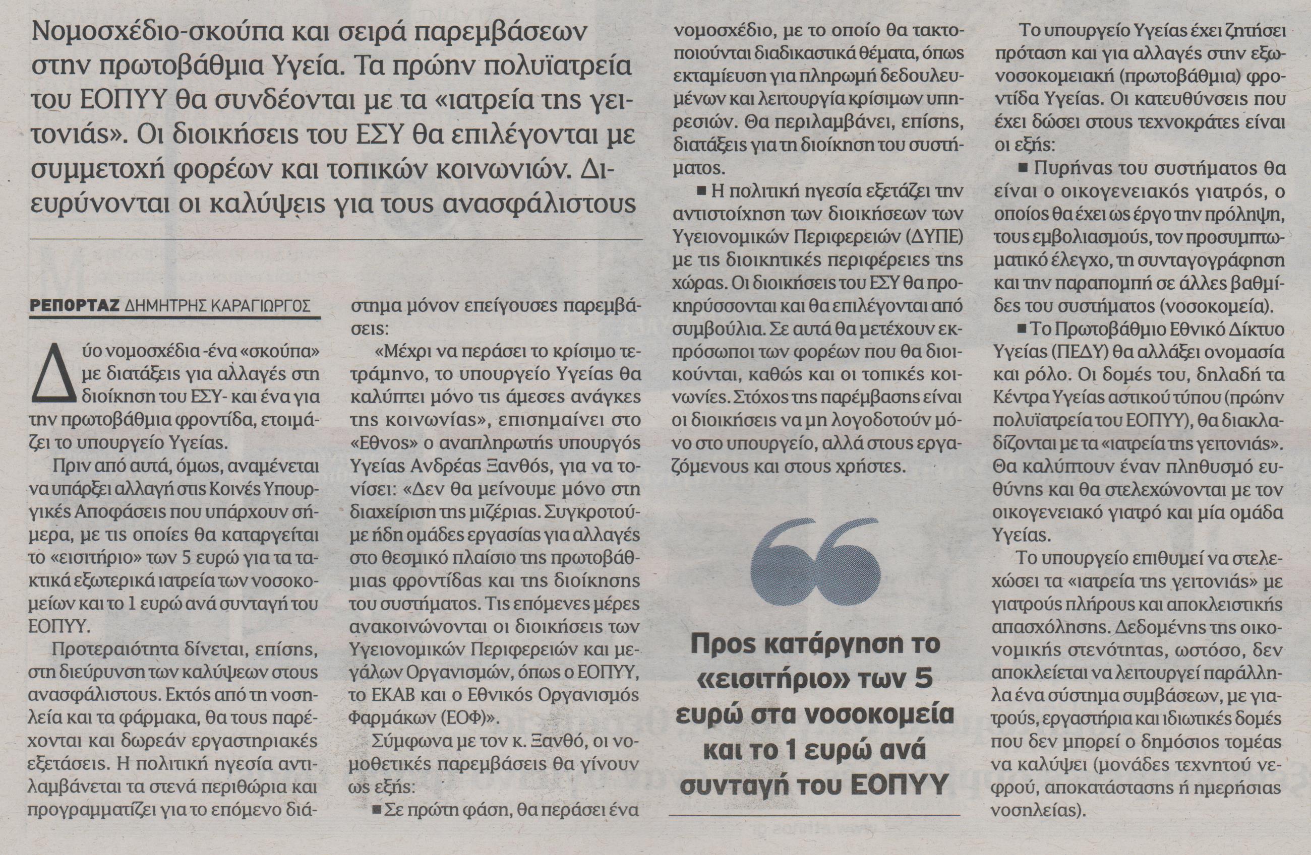 Πριν από αυτά, όμως, αναμένεται να υπάρξει αλλαγή στις Κοινές Υπουργικές Αποφάσεις που υπάρχουν σήμερα, με τις οποίες θα καταργείται το «εισιτήριο» των 5 ευρώ για τα τακτικά εξωτερικά ιατρεία των νοσοκομείων και το 1 ευρώ ανά συνταγή του ΕΟΠΥΥ.