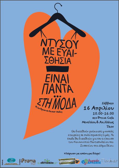 Ένα ξεχωριστό Φιλανθρωπικό Μπαζάρ Ρούχων πραγματοποιεί ο Φορέας Κ.Σ.Δ.Ε.Ο. «ΕΔΡΑ» το Σάββατο 16 Απριλίου 2015, 10.00-16.00, στο Prova Cafe Μενελάου & Αχιλλέως, Ίλιον με σκοπό την ενίσχυση των Κοινωνικών Δομών Άμεσης Αντιμετώπισης της Φτώχειας στο Δήμο Ιλίου.
