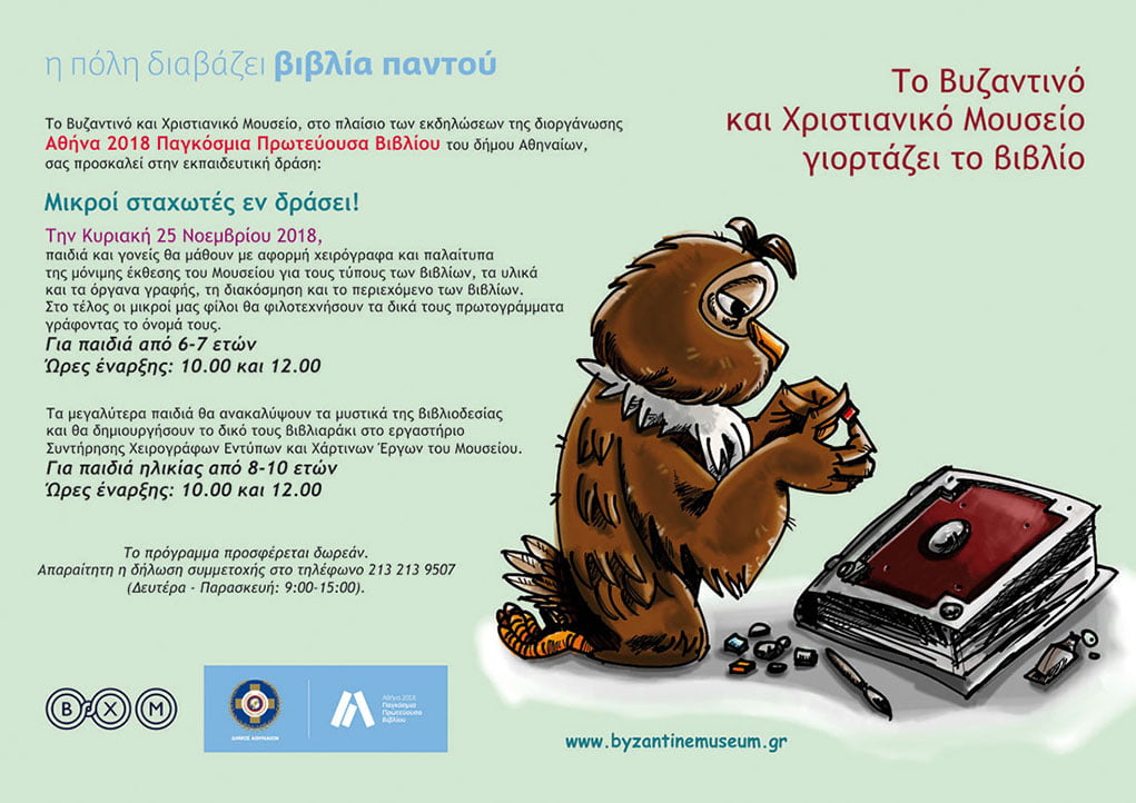 Την Κυριακή 25 Νοεμβρίου, το Βυζαντινό και Χριστιανικό Μουσείο, στο πλαίσιο της διοργάνωσης «Αθήνα 2018 Παγκόσμια Πρωτεύουσα Βιβλίου»,παρουσιάζει εκπαιδευτικά προγράμματα, με θέμα «Μικροί σταχωτές εν δράσει!».