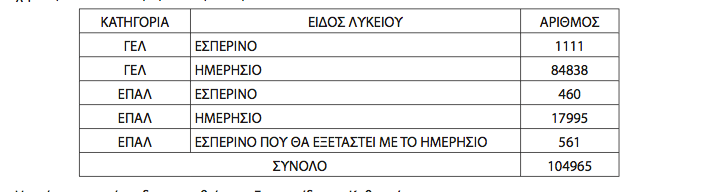 Συνολικά 104.965 υποψήφιοι για τα ΑΕΙ δήλωσαν συμμετοχή στις Πανελλαδικές Εξετάσεις οι οποίοι διεκδικούν 70.726 θέσεις και συγκεκριμένα 43.758 για τα Πανεπιστήμια και 26.968 για τα ΤΕΙ.