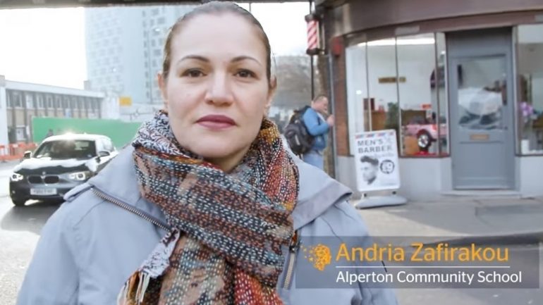 Η ‘Αντρια Ζαφειράκου εργάζεται στο κοινοτικό σχολείο Άλπερτον, στο Μπρεντ στο Βόρειο Λονδίνο, σε μια φτωχή γειτονιά όπου ζουν πολλοί μετανάστες. Εκατόν τριάντα διαφορετικές εθνικότητες ζουν στο Μπρεντ και η Ζαφειράκου αποφάσισε να μάθει ορισμένες βασικές εκφράσεις στις 35 γλώσσες που ομιλούνται στο σχολείο της, για να μπορεί να επικοινωνεί με τους μαθητές της και τους γονείς τους. Ανάμεσα στις γλώσσες στις οποίες μπορεί να συνεννοηθεί είναι η Χίντι, η Γκουτζαράτι και η Ταμίλ.