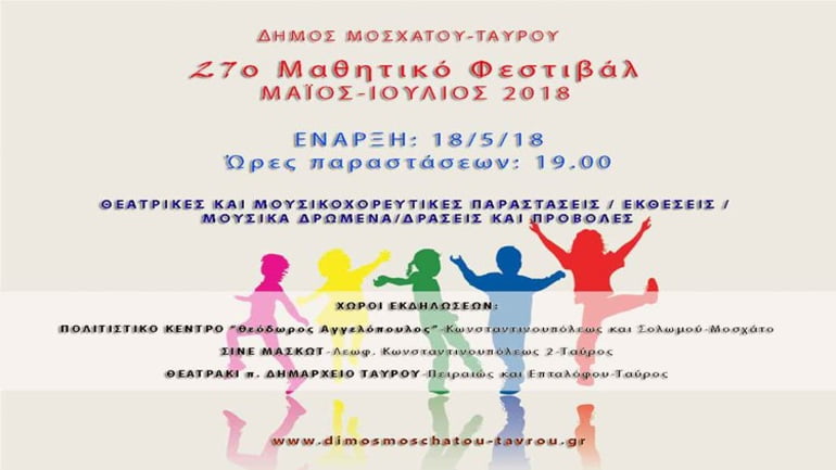 Με ένα πλούσιο πρόγραμμα ψυχαγωγικών εκδηλώσεων από τη μαθητική και εκπαιδευτική κοινότητα Μοσχάτου-Ταύρου, ξεκινά αύριο Παρασκευή το 27ο Μαθητικό Φεστιβάλ του Δήμου της περιοχής.