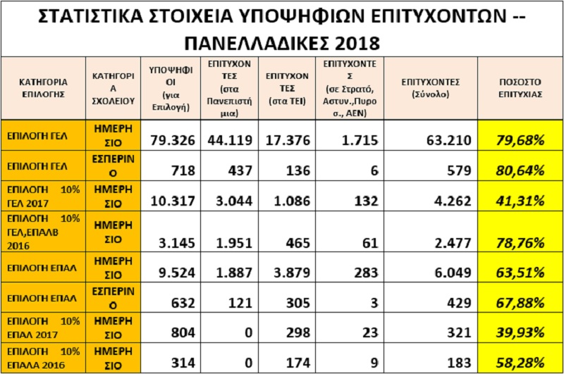 Αναλυτικά, από τους υποψηφίους των ΓΕΛ (ημερήσια και εσπερινά) σχεδόν 8 στους 10 πέτυχαν να εισαχθούν σε κάποια σχολή της Τριτοβάθμιας Εκπαίδευσης (από τους 80.044 πέτυχαν οι 63.789, ποσοστό 79,69%). Από τα ΕΠΑΛ (ημερήσια και εσπερινά), από τους 10.156 υποψηφίους πέτυχαν οι 6.478, ποσοστό της τάξεως του 63,78%. Το ποσοστό επιτυχίας για όσους έκαναν αίτηση μηχανογραφικού, ώστε να εισαχθούν με το 10%, ήταν ένας στους δύο, αφού από τους 14.898 υποψήφιους εισήχθησαν στην Τριτοβάθμια Εκπαίδευση οι 7.489 (το 50,27%).