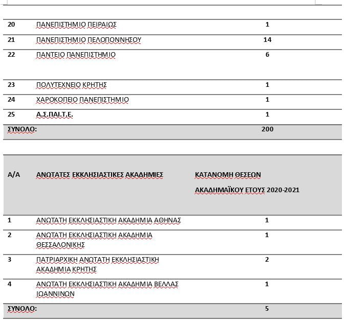Επισυνάπτεται ο πίνακας με την κατανομή των θέσεων ανά Ίδρυμα