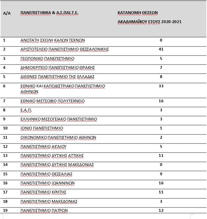 Οι περισσότερες θέσεις κατανέμονται στο Αριστοτέλειο Πανεπιστήμιο Θεσσαλονίκης (41) και στη συνέχεια στο Εθνικό και Καποδιστριακό Πανεπιστήμιο Αθηνών (33). Ακολουθούν με 16 θέσεις το Εθνικό Μετσόβιο Πολυτεχνείο και το Πανεπιστήμιο Ιωαννίνων. Δεκατέσσερις (14) θέσεις κατανέμονται στο Πανεπιστήμιο Πελοποννήσου και 12 στο Πανεπιστήμιο Πατρών. Από 11 θέσεις λαμβάνουν το Πανεπιστήμιο Δυτικής Αττικής και το Πανεπιστήμιο Κρήτης. Μία θέση κατανέμεται στην ΑΣΠΑΙΤΕ και πέντε στις ΑΕΑ. Οι υπόλοιπες θέσεις κατανέμονται στα ελληνικά ΑΕΙ, με εξαίρεση την Ανώτατη Σχολή Καλών Τεχνών και το Πανεπιστήμιο Δυτικής Μακεδονίας, στα οποία δεν προβλέπεται καμία θέση.