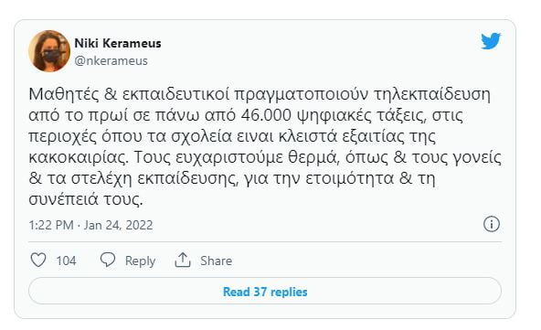 Σε ανάρτησή της, η υπουργός Παιδείας Νίκη Κεραμέως επισήμανε ότι έγιναν μαθήματα σε πάνω από 46.000 ψηφιακές τάξεις, ευχαριστώντας θερμά τους εκπαιδευτικούς, τους μαθητές και τους γονείς.