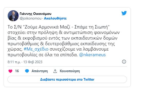 Στο νομοσχέδιο για την πρόληψη και αντιμετώπιση της ενδοσχολικής βίας αναφέρεται με ανάρτησή του στο Twitter ο κυβερνητικός εκπρόσωπος, Γιάννης Οικονόμου.