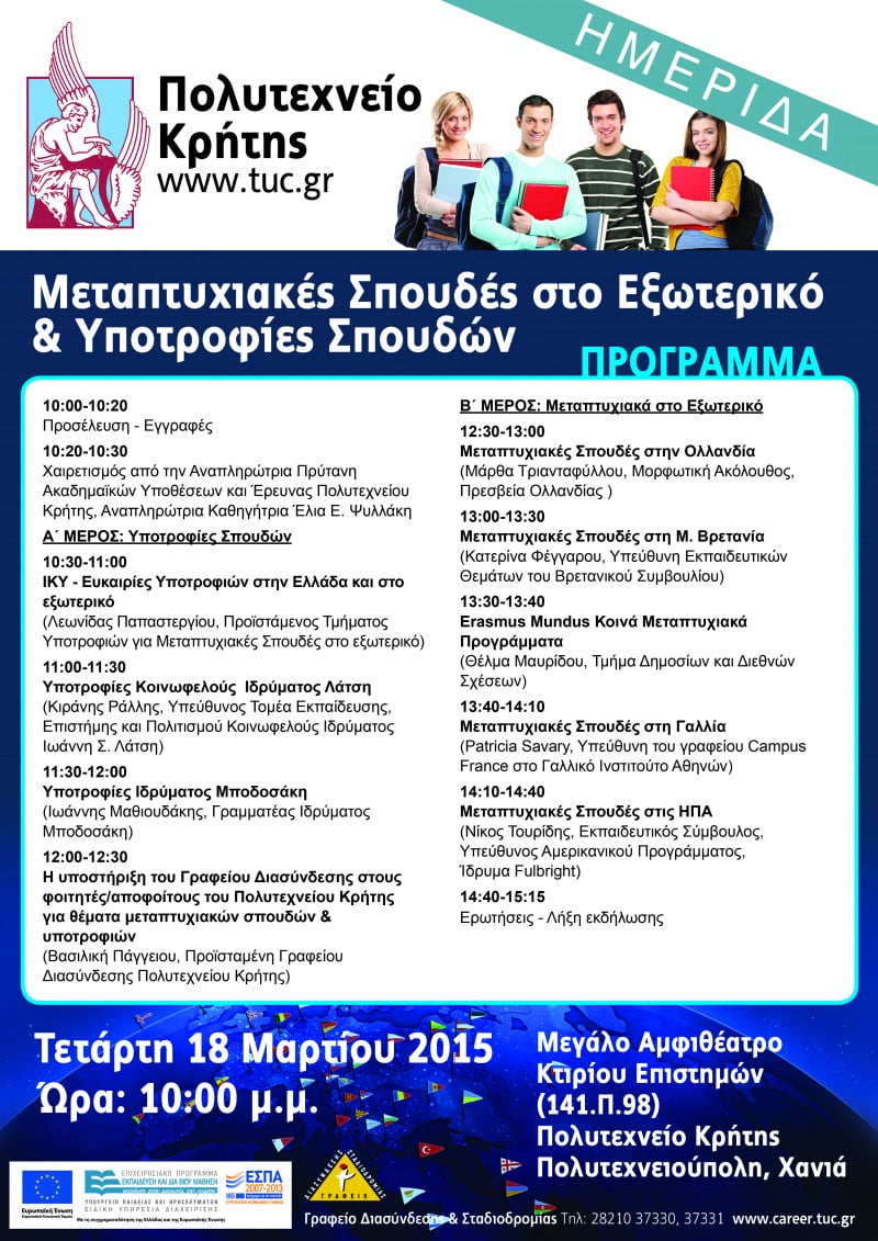 To Πολυτεχνείο Κρήτης διοργανώνει ημερίδα με θέμα «Μεταπτυχιακές Σπουδές στο εξωτερικό & Υποτροφίες Σπουδών», την Τετάρτη 18 Μαρτίου 2015 και ώρα 10.00-15.00, στο Μεγάλο Αμφιθέατρο του Κτιρίου Επιστημών (141.Π.98), στην Πολυτεχνειούπολη.