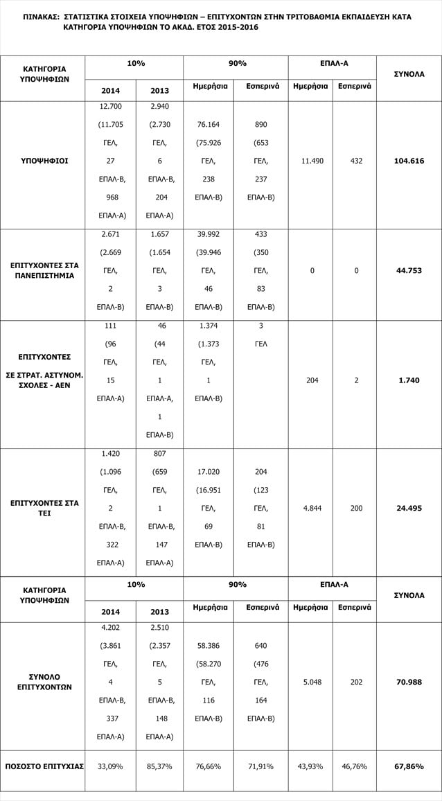 Οι επιτυχόντες είναι λιγότεροι από πέρυσι, καθώς το 2014 εισήχθησαν σε ΑΕΙ και ΤΕΙ 72.763 υποψήφιοι.