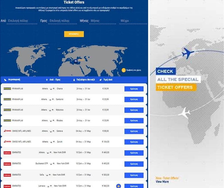 Η νέα υπηρεσία ξεκίνησε στις 4 Αυγούστου με προσφορές από τις Emirates, Swiss, Blue Air, Royal Jordanian, Ryanair κ.α. Καθημερινά εμπλουτίζεται με νέες προσφορές προσφέροντας στους χρήστες εύκολη και γρήγορη πλοήγηση καθόλο το 24ωρο. Σημειώνεται ότι οι τιμές των προσφορών αντιστοιχούν σε ταξίδια μετ’ επιστροφής και περιλαμβάνουν όλους τους σχετικούς φόρους.