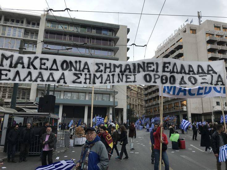 «Η Μακεδονία είναι ελληνική», «το όνομα μας είναι η ψυχή μας» και «Μακεδόνας σημαίνει Έλληνας» είναι μόνο μερικά από τα συνθήματα και τα πανό που κυριαρχούν.