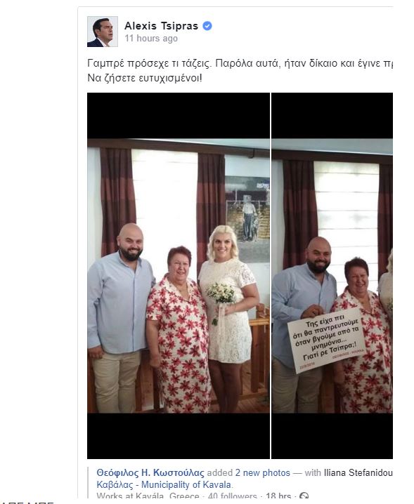 Με μια χιουμοριστική ανάρτηση στον προσωπικό λογαριασμό του στο Facebook ο Αλέξης Τσίπρας ευχήθηκε σε ένα ζευγάρι που παντρεύτηκε την Τετάρτη στην Καβάλα.
