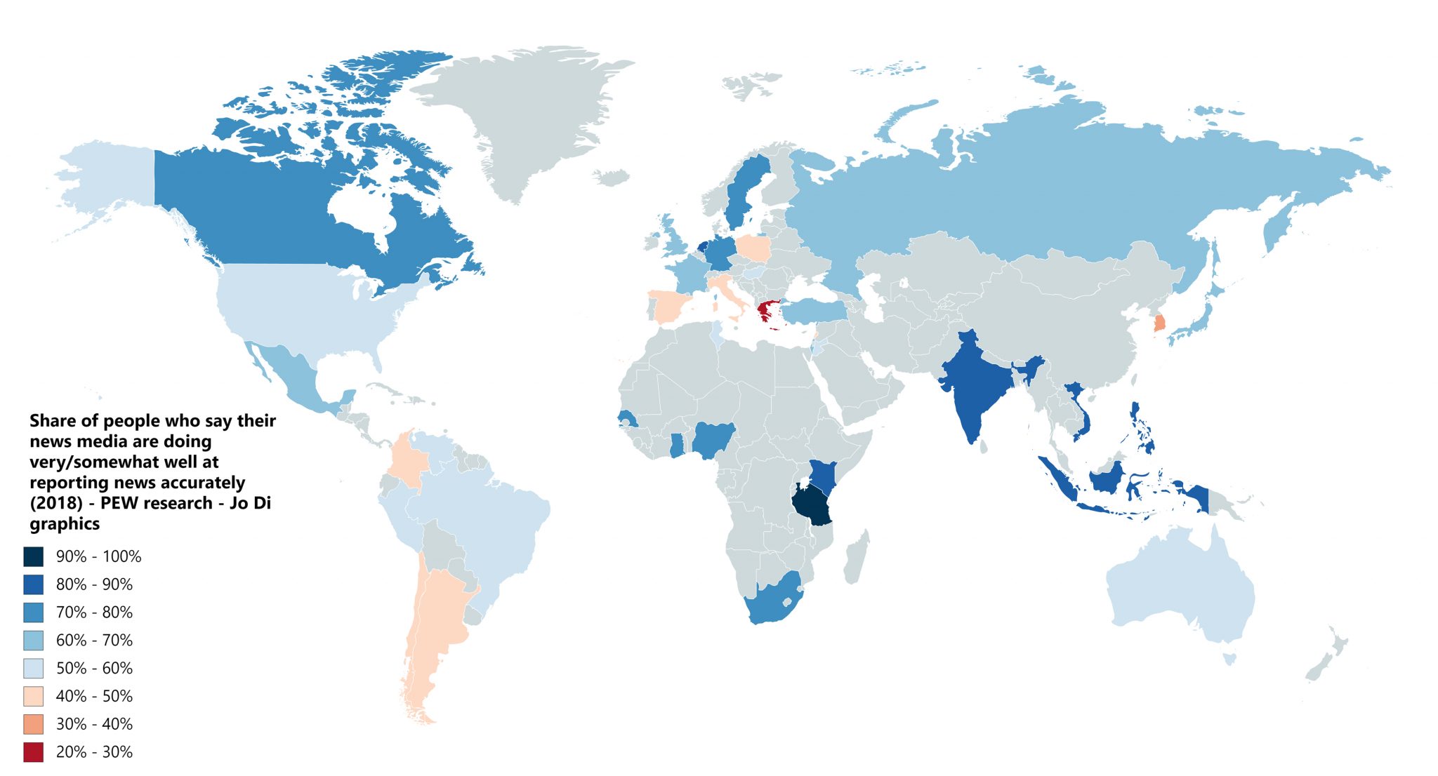 Μόνο το 52% των συμμετεχόντων στα 38 ερωτηθέντα κράτη λένε ότι τα ΜΜΕ στη χώρα τους κάνουν καλή δουλειά στο να παρουσιάζουν δίκαια και αμερόληπτα τα πολιτικά ζητήματα, ενώ το 44% είπε ότι δεν το κάνουν. Και παρόλο που οι πλειοψηφίες των πολιτών σε 18 χώρες λένε ότι τα μέσα ενημέρωσης τους αποδίδουν καλά σε αυτόν τον τομέα, οι στάσεις είναι πιο αρνητικές στις υπόλοιπες 20 χώρες που συμμετείχαν στην έρευνα. Οι πιο επικριτικοί είναι οι Ισπανοί, οι Έλληνες και οι Νοτιοκορεάτες, όπου τουλάχιστον έξι στους δέκα λένε ότι τα μέσα ενημέρωσης δεν κάνουν καλά τη δουλειά τους στην μεταφορά των ειδήσεων αμερόληπτα.