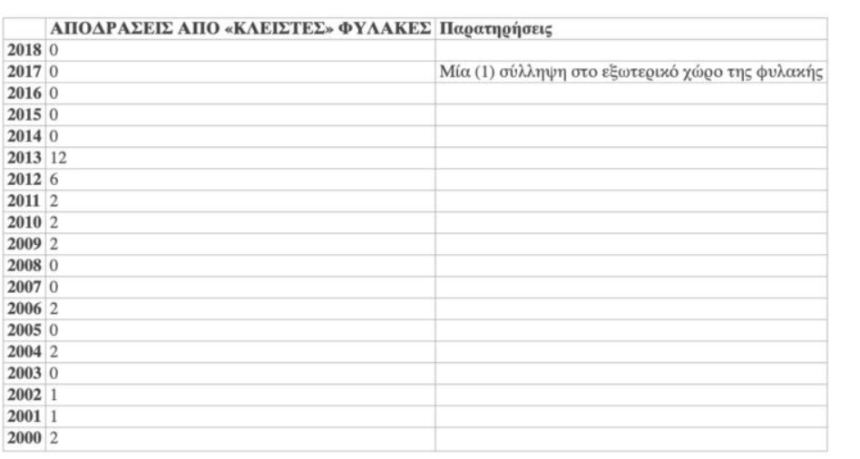 Επισημαίνεται, επίσης, ότι ειδικά για το χρονικό διάστημα των εορτών έχουν δοθεί ρητές εντολές στα Καταστήματα Κράτησης από το Υπουργείο (στις 11 Δεκεμβρίου 2018, στις 19 Δεκεμβρίου 2018 και στις 27 Δεκεμβρίου 2018) για «επίταση των μέτρων ασφαλείας» προκειμένου να αποτραπούν κάθε είδους έκνομες ενέργειες. Ας σημειωθεί, τέλος, ότι από το 2015 μέχρι σήμερα, και παρά τις αντίθετες «Κασσάνδρες», η σημερινή απόδραση είναι η πρώτη που συμβαίνει από κλειστή φυλακή, σε αντίθεση με τα προηγούμενα έτη (βλ. πίνακα).