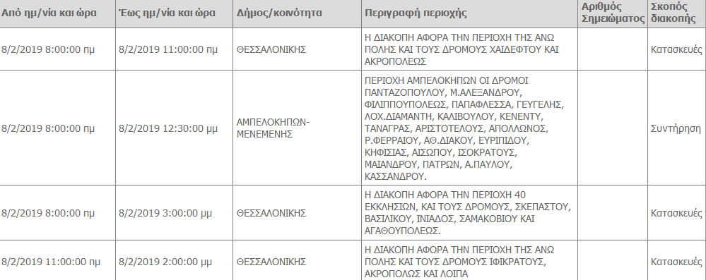 Διακοπές ρεύματος θα σημειωθούν σήμερα σε περιοχές της Θεσσαλονίκης.