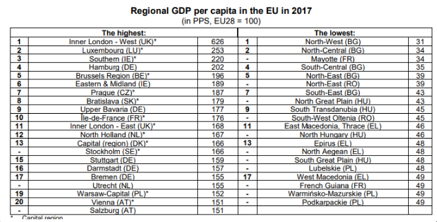 Ειδικότερα, το 2017, το κατά κεφαλήν ΑΕΠ (σε όρους αγοραστικής δύναμης) ανά περιφέρεια κυμάνθηκε από το 31% του ευρωπαϊκού μέσου όρου στη βορειοανατολική Βουλγαρία έως το 626% στο Δυτικό Λονδίνο.