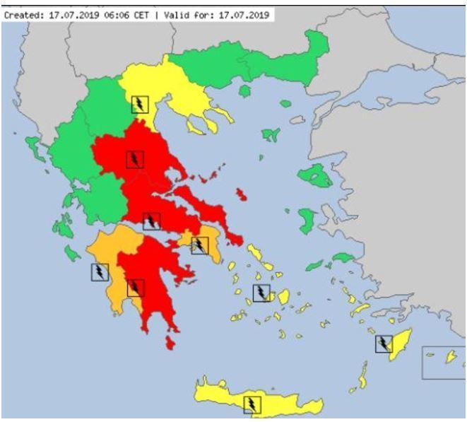 Στην πορτοκαλί ζώνη (ισχυρές καταιγίδες) του MeteoAlarm εντάσσονται η Αττική και η δυτική Πελοπόννησος, ενώ πιο ήπια φαινόμενα αναμένονται σε Κυκλάδες, Κεντρική Μακεδονία, Δωδεκάνησα και Κρήτη.