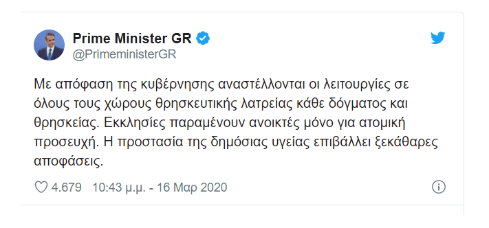 Εκκλησίες παραμένουν ανοικτές μόνο για ατομική προσευχή. Η προστασία της δημόσιας υγείας επιβάλλει ξεκάθαρες αποφάσειςανακοίνωσε ο πρωθυπουργός.