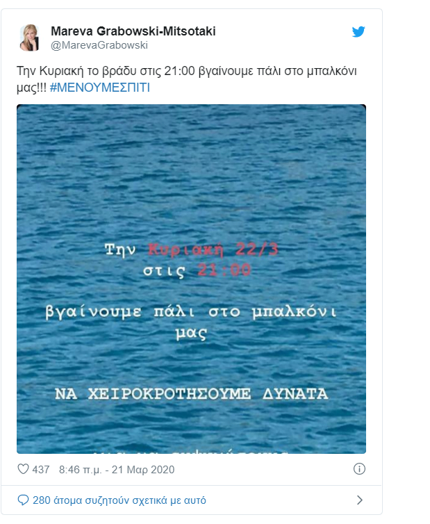 «Την Κυριακή το βράδυ στις 21:00 βγαίνουμε πάλι στο μπαλκόνι μας!», έγραψε στο Twitter η σύζυγος του πρωθυπουργού.
