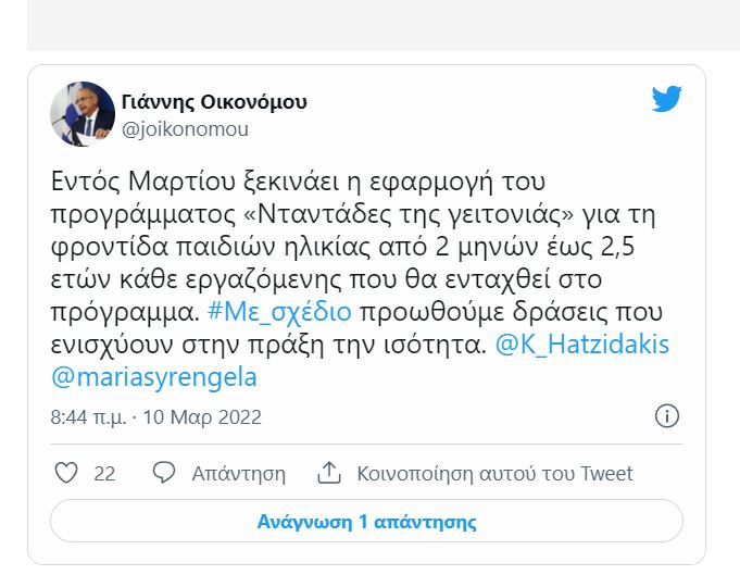 Συγκεκριμένα, ο κ. Οικονόμου αναφέρει: «Εντός Μαρτίου ξεκινάει η εφαρμογή του προγράμματος “Νταντάδες της γειτονιάς” για τη φροντίδα παιδιών ηλικίας από 2 μηνών έως 2,5 ετών κάθε εργαζόμενης που θα ενταχθεί στο πρόγραμμα. #Με_σχέδιο προωθούμε δράσεις που ενισχύουν στην πράξη την ισότητα. @K_Hatzidakis @mariasyrengela».