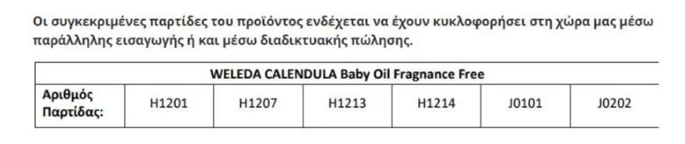 Tην ανάκληση των παρτίδων του παρακάτω πίνακα του καλλυντικού προϊόντος “WELEDA CALENDULA Baby Oil Fragnance Free”, καθώς υπάρχει το ενδεχόμενο επιμόλυνσης με σταγονίδια νερού, κατά την εμφιάλωση, το οποίο θα μπορούσε να οδηγήσει στην ανάπτυξη μικροοργανισμών και σε δυνητικό κίνδυνο μόλυνσης του δέρματος, ιδιαίτερα σε ευαίσθητους καταναλωτές ή σε καταναλωτές με εξασθενημένο ανοσοποιητικό σύστημα, ανακοίνωσε ο ΕΟΦ.