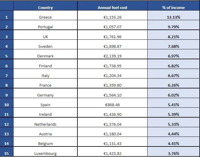 Η ετήσια δαπάνη των Ελλήνων οδηγών για καύσιμα είναι 1.153,26 ευρώ. Ακολουθεί η Πορτογαλία, με τους οδηγούς να δαπανούν σχεδόν το ένα δέκατο (9,79%) του εισοδήματός τους σε καύσιμα ετησίως.