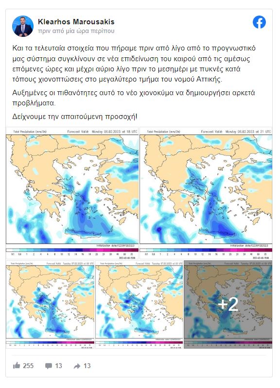 Ειδικότερα στην ανάρτησή του στο Facebook ο μετεωρολόγος γράφει τα εξής: «Και τα τελευταία στοιχεία που πήραμε πριν από λίγο από το προγνωστικό μας σύστημα συγκλίνουν σε νέα επιδείνωση του καιρού από τις αμέσως επόμενες ώρες και μέχρι αύριο λίγο πριν το μεσημέρι με πυκνές κατά τόπους χιονοπτώσεις στο μεγαλύτερο τμήμα του νομού Αττικής. Αυξημένες οι πιθανότητες αυτό το νέο χιονοκύμα να δημιουργήσει αρκετά προβλήματα. Δείχνουμε την απαιτούμενη προσοχή!».
