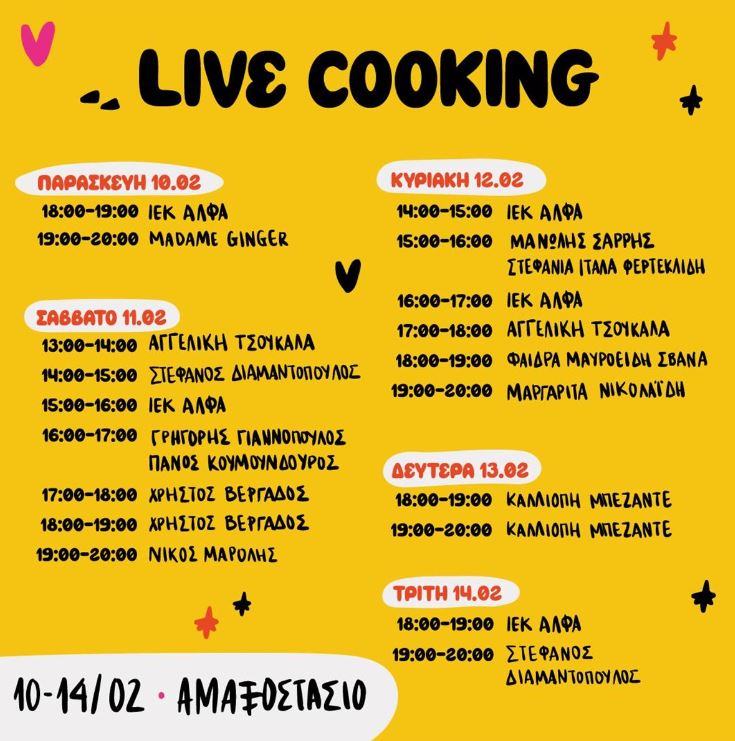Θα έχετε την ευκαιρία να δείτε και live cooking με celebrity chefs, όπως τους: Μανώλη Σαρρή, Γρηγόρη Γιαννόπουλο, Πάνο Κουμουνδούρο, Καλλιόπη Μπεζαντέ, Χρήστο Βέργαδο, Μαργαρίτα Νικολαϊδη, Madame Ginger, Αγγελική Τσουκαλά, Φαίδρα Μαυροειδή Σβανά και πολλούς ακόμη.