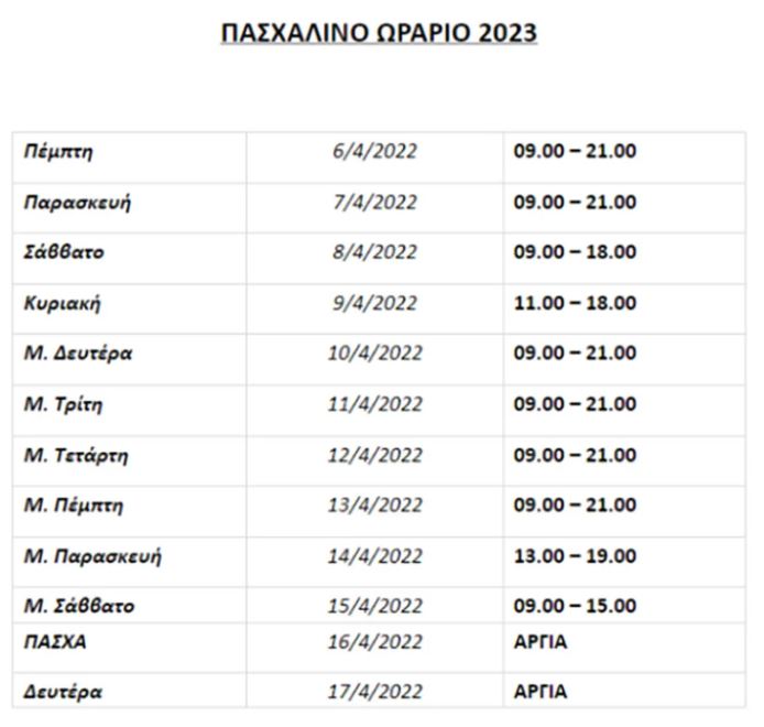 Σύμφωνα με το πρόγραμμα, το εορταστικό ωράριο των καταστημάτων θα ξεκινήσει την Πέμπτη 6 Απριλίου. Κλειστά, όπως κάθε χρόνο, θα παραμείνουν όλα τα καταστήματα την Κυριακή και τη Δευτέρα του Πάσχα.