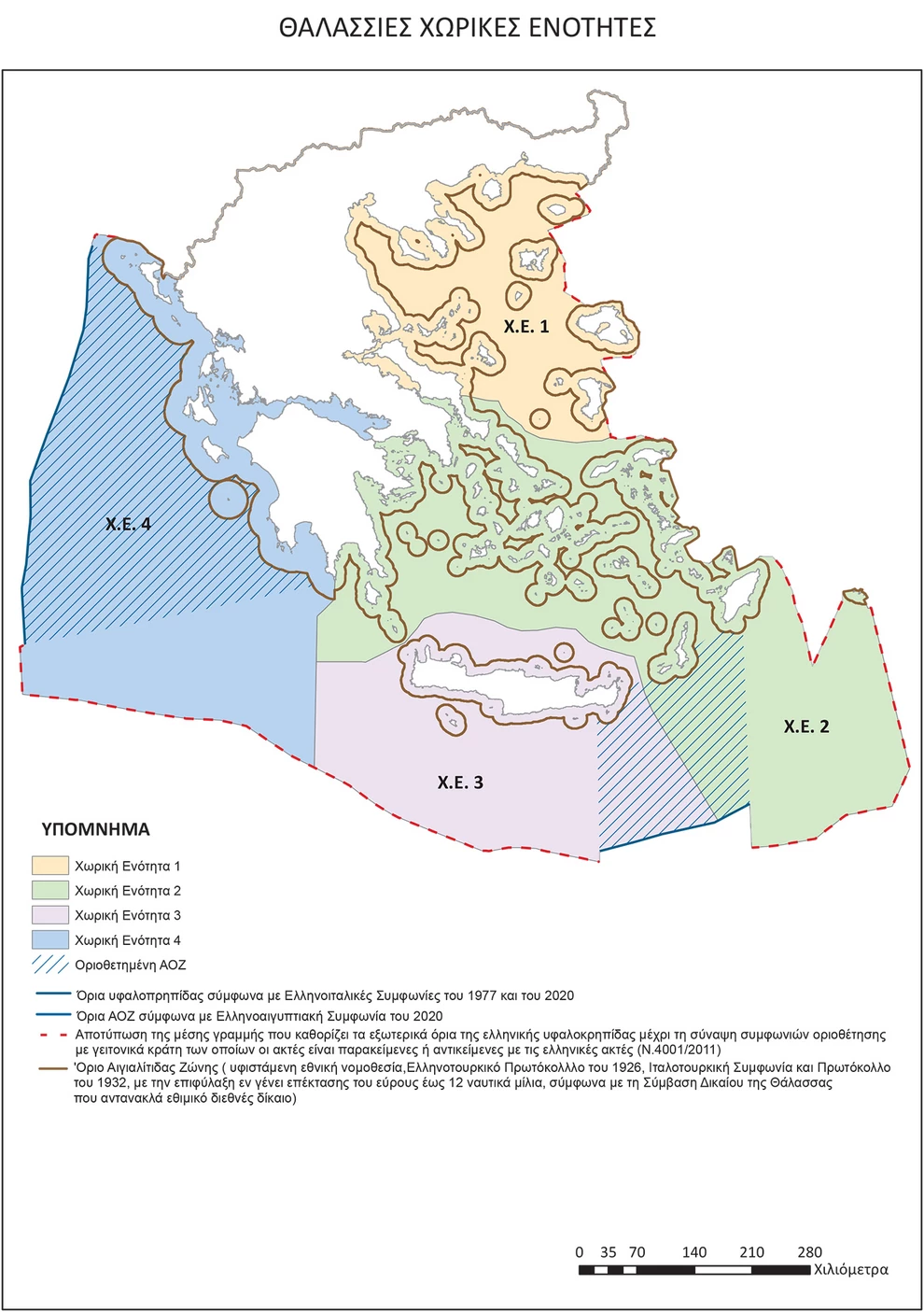 Οι θαλάσσιες περιοχές που αποτυπώνονται στον χάρτη, συμπεριλαμβάνουν τις ελληνοϊταλικές συμφωνίες οριοθέτησης ΑΟΖ του 1977 και του 2020 και την ελληνοαιγυπτιακή συμφωνία του 2020, ενώ συμπίπτουν με τα όρια που απορρέουν από τον νόμο 4001/2011.