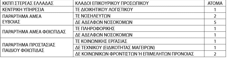 Συγκεκριμένα με απόφαση του υπουργείου Εργασίας δεκατεσσάρων (14) ατόμων διαφόρων ειδικοτήτων ως επικουρικό προσωπικό, με σχέση εργασίας ιδιωτικού δικαίου ορισμένου χρόνου (Ι.Δ.Ο.Χ.), διάρκειας ενός (1) έτους, στο Κέντρο Κοινωνικής Πρόνοιας Περιφέρειας Στερεάς Ελλάδας.
