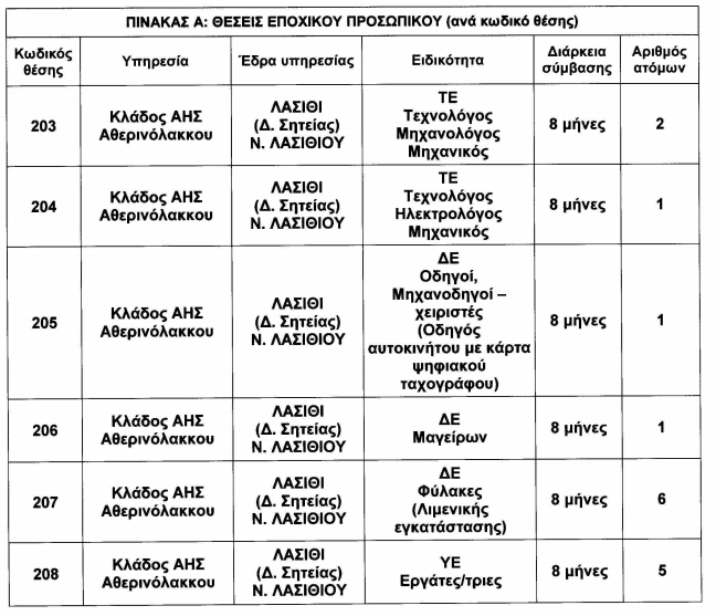 Η ΔΕΗ ανακοινώνει την πρόσληψη, με σύμβαση εργασίας ιδιωτικού δικαίου ορισμένου χρόνου, συνολικά δεκαεξι (16) ατόμων για την κάλυψη εποχικών ή παροδικών αναγκών του Κλάδου ΑΗΣ Αθερινόλακκου, που εδρεύει στο Νομό Λασιθίου και συγκεκριμένα του εξής, ανά υπηρεσία, έδρα, ειδικότητα και διάρκεια σύμβασης, αριθμού ατόμων: