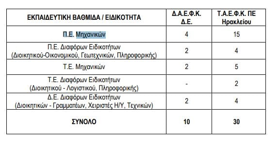 Το Υπουργείο Υποδομών και Μεταφορών, προκειμένου να καλύψει τις άμεσες, απρόβλεπτες και κατεπείγουσες ανάγκες αποκατάστασης των επιπτώσεων που προέκυψαν από φυσικές καταστροφές θα προβεί σε πρόσληψη προσωπικού με σύμβαση εργασίας ιδιωτικού δικαίου ορισμένου χρόνου διάρκειας έως οκτώ (8) μηνών, για τη στελέχωση της Διεύθυνσης Αποκατάστασης Επιπτώσεων Φυσικών Καταστροφών Δυτικής Ελλάδος (Δ.Α.Ε.Φ.Κ. ΔΕ), με έδρα την Πάτρα, της Γενικής Διεύθυνσης Αποκατάστασης Επιπτώσεων Φυσικών Καταστροφών (Γ.Δ.Α.Ε.Φ.Κ.) της Γενικής Γραμματείας Υποδομών και του Τομέα Αποκατάστασης Επιπτώσεων Φυσικών Καταστροφών Περιφερειακής Ενότητας Ηρακλείου (Τ.Α.Ε.Φ.Κ. ΠΕ Ηρακλείου), που εδρεύει στο Ηράκλειο Κρήτης, της ιδίας Γενικής Διεύθυνσης και Γενικής Γραμματείας, του Υπουργείου Υποδομών και Μεταφορών, σύμφωνα με τις διατάξεις : α) του άρθρου 36 του ν.4765/2021 (Α΄6), όπως ισχύει, β) του π.δ.410/1988 (Α’ 181) και γ) την αριθμ.77427/15-03-2022 (ΑΔΑ:61ΜΖ465ΧΘΞ-Σ1Δ) Απόφαση του Υπουργού Υποδομών και Μεταφορών, σχετικά με πρόσληψη προσωπικού, με σύμβαση εργασίας ιδιωτικού δικαίου ορισμένου χρόνου οκτάμηνης διάρκειας, για την στελέχωση – ενίσχυση των ανωτέρω Υπηρεσιών του Υπουργείου Υποδομών και Μεταφορών.Ο αριθμός των προς κάλυψη θέσεων ανέρχεται σε σαράντα (40) και η κατανομή των θέσεων ανά Υπηρεσία, εκπαιδευτική βαθμίδα και ειδικότητα, περιγράφονται κατωτέρω: