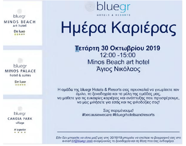 Η ομάδα της bluegr Hotels & Resorts διοργανώνει στις 30/10/2019 και ώρα 12:00-15:00, στο Minos Beach art hotel στον Άγιο Νικόλαο Κρήτης Ημέρα Καριέρας με στόχο τη γνωριμία με τον όμιλο, τα ξενοδοχεία και τα μέλη της ομάδας, καθώς και τις ευκαιρίες καριέρας και ανάπτυξης που προσφέρονται.