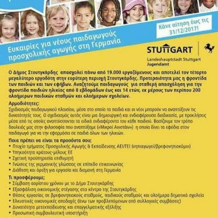 Ελληνόγλωσσο φυλλάδιο, που διανέμεται από το δήμο Στουτγκάρδης στα γραφεία των ελληνικών κοινοτήτων της Γερμανίας, σε σημεία που συχνάζουν Έλληνες και στο διαδίκτυο αναφέρει : «Αναζητούμε παιδαγωγούς για σταθερή απασχόληση για την φροντίδα παιδιών ηλικίας από 8 εβδομάδων έως 14 ετών, εκ μέρους των περίπου 200 ολοήμερων παιδικών σταθμών και ολοήμερων σχολείων». Ο δήμο Στουτγάρδης αποτελεί σήμερα τον τέταρτο μεγαλύτερο εργοδότη στο κρατίδιο της Βάδης-Βυρτεμβέργης, με τους δημοτικούς υπαλλήλους και εργαζόμενους να φτάνουν τους 19.000.