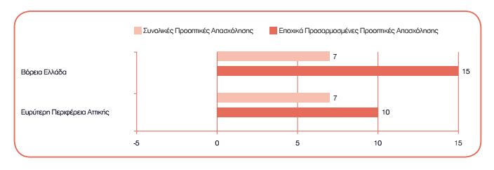 Οι προοπτικές προσλήψεων και στις δύο γεωγραφικές περιοχές ενισχύονται σε σχέση με το αντίστοιχο διάστημα του προηγούμενου έτους. Σημαντική αύξηση, κατά 11 ποσοστιαίες μονάδες, καταγράφεται στη Βόρεια Ελλάδα, ενώ οι Προοπτικές στην Ευρύτερη Περιφέρεια Αττικής βελτιώνονται κατά 2 ποσοστιαίες μονάδες.