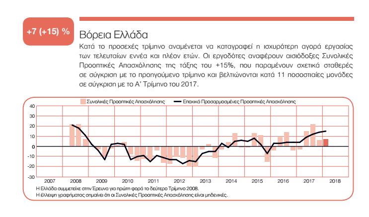 Οι εργοδότες και στις δύο γεωγραφικές περιοχές αναμένουν αύξηση του αριθμού των απασχολουμένων κατά το Α’ Τρίμηνο του 2018. Οι εργοδότες στη Βόρεια Ελλάδα προβλέπουν έναν σταθερό ρυθμό προσλήψεων, με Συνολικές Προοπτικές Απασχόλησης της τάξης του +15%, ενώ οι Προοπτικές στην Ευρύτερη Περιφέρεια Αττικής ανέρχονται σε +10%.