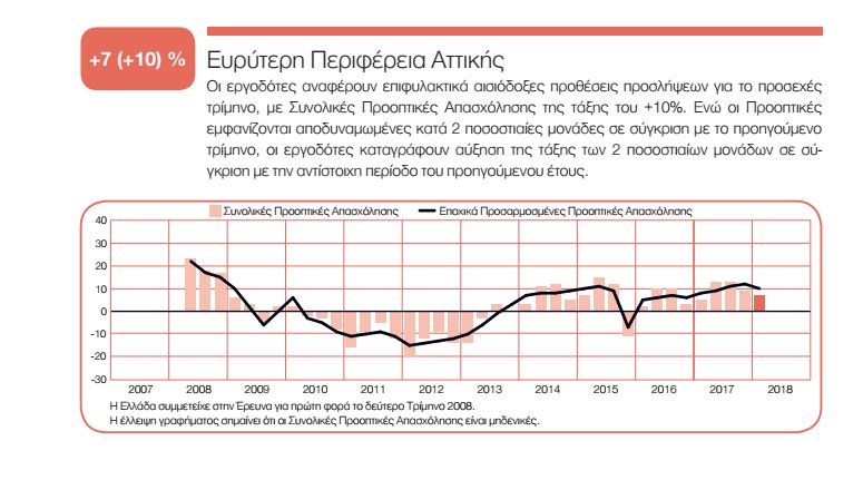 Σε σύγκριση με το τελευταίο τρίμηνο του 2017, οι εργοδότες στην Ευρύτερη Περιφέρεια Αττικής καταγράφουν μικρή μείωση, της τάξης των 2 ποσοστιαίων μονάδων, ενώ οι Προοπτικές για τη Βόρεια Ελλάδα παραμένουν σχετικά σταθερές.